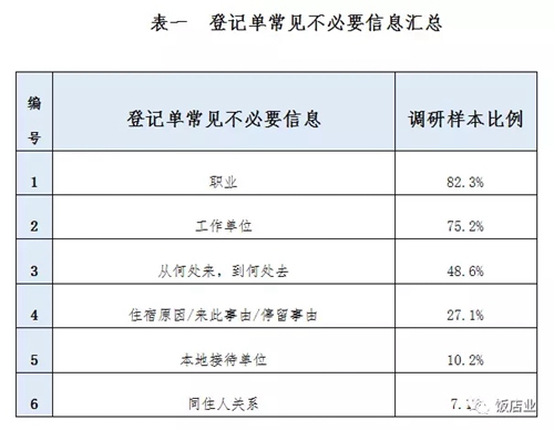 隨著社會的進步和顧客的需求,大部分的酒店時常更新自己的硬件設施和娛樂設施,但是酒店的住宿登記單卻仍然換湯不換藥。最常見的就是住宿登記單上要求顧客填寫住宿目的、職業、從何處來、到何處去與同住人關系等與合同權利義務無關的內容。筆者收集了70份酒店住宿登記單作為調研樣本。樣本內容反映,其中要求填寫“職業”為82%;要求填寫“工作單位”為75%;要求填寫“從何處來、到何處去”為48.6%;要求填寫“本地接待單位”為10.2%;要求填寫“停留原因”為27.1%;要求旅客填寫“同住人關系”的比例雖然不高,但是也有7.1%。