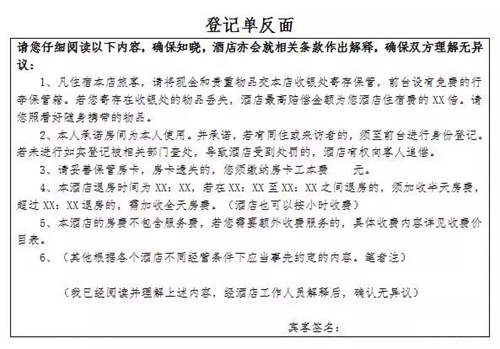 結合上述分析,筆者對酒店住宿登記單的內容進行了梳理,并整理出必須填寫的內容和必須事先約定的條款。