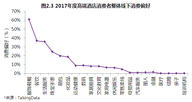 通過分析高端酒店消費者基本屬性后,我們已經圈定了高端酒店的目標消費人群,那么這些人群在實際線下消費過程中有哪些偏好呢?從宏觀消費類型來看,服飾鞋帽、餐飲、生活服務是高端酒店消費者主要消費的三種產品類型。這些消費多以大眾品牌消費為主,占比達46%,奢侈品牌僅占10%,與國內平均消費水平基本吻合。