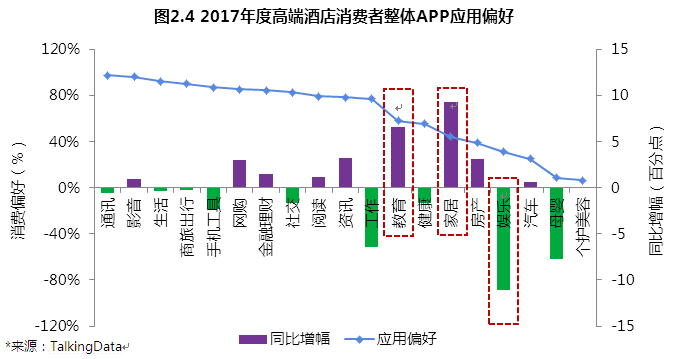 對于高端酒店經營者而言,僅圍繞消費者已產生的消費需求進行服務展開是遠遠不夠的。通過對高端酒店消費者APP應用偏好進行分析,可以幫助酒店更有效地進行針對性營銷,從而擴大目標消費群體。從2017年前三個季度高端酒店消費者的整體APP應用類型上來看,通訊、影音和生活是其主要使用的三大類APP。但就增長率而言,教育、家居類型的APP在2017年的使用頻率明顯提升,增長幅度超過5個百分點,而娛樂型APP的偏好度則出現大幅下滑。