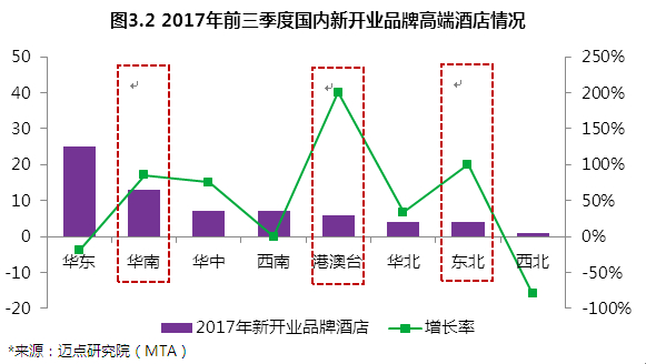 與目前高端酒店市場地區分布不同,2017年前三季度,港澳臺及華南地區開業的品牌高端酒店有較大幅度的增長,增長率均超過100%,顯示出了強大的市場潛力。這兩個地區高端酒店市場相對成熟,因此更容易吸引海內外品牌落地。