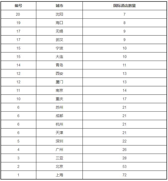 新聞來源:宏輝智通 發(fā)布日期:2017-12-04 瀏覽次數(shù):3898國際五星酒店數(shù)量最多的是上海, 共72家,比北京整整多出19家,排名前20的城市中,江浙一帶酒店比重偏多,南京、無錫、寧波均有上板。