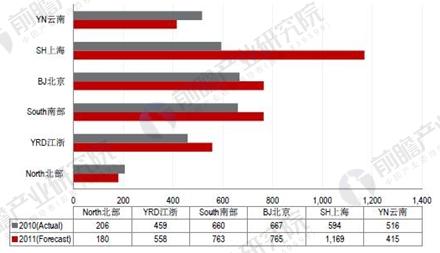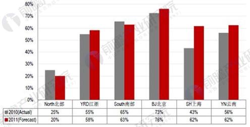 在入住率方面,我國南部地區(qū)精品酒店的入住率遠(yuǎn)高于北部地區(qū),兩者2011年入住率分別是63%和20%。從重點(diǎn)城市來看,北京的精品酒店入住率最高,在75%左右;其次是云南和上海,其入住率在2011年上升較快,均達(dá)到62%;浙江2011年的精品酒店入住率為58%。