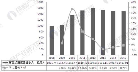 2008-2015年中國高星級酒店市場營業(yè)收入情況(單位:億元,%)
