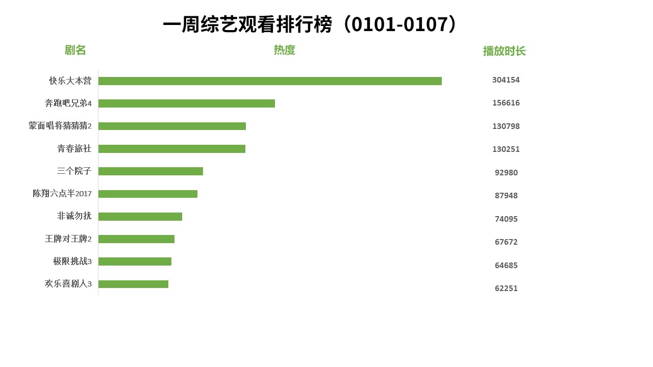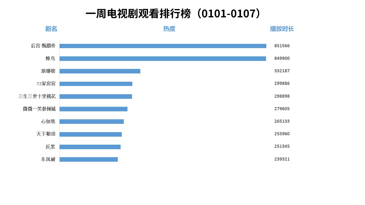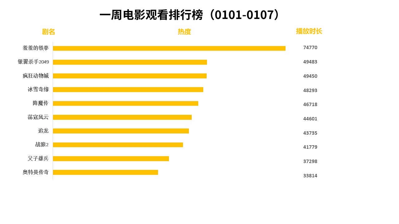 新聞來源:宏輝智通 發布日期:2018-01-18 瀏覽次數:3222【流媒體網】消息:廣東IPTV發布1月1日-1月7日電視劇、電影、綜藝、卡通節目觀看排行榜。電視劇觀看排行榜前三位是《后宮·甄嬛傳》、《蜂鳥》、《瑯琊榜》; 電影觀看排行榜前三位是《羞羞的鐵拳》、《銀翼殺手2049》、《瘋狂動物城》;綜藝觀看排行榜前三甲是《快樂大本營》、《奔跑吧兄弟4》、《蒙面唱將猜猜猜2》;卡通觀看排行榜前三位是《熊出沒》、《兔小貝兒歌》、《汪汪隊立大功》。