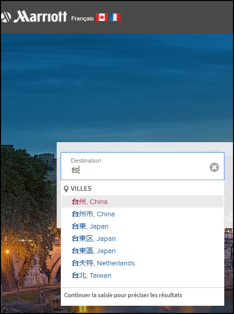 登陸萬豪法文版、意大利文版查詢,沒有出現臺中、臺南,但臺東仍顯示為屬于日本,推薦的是東京的酒店。