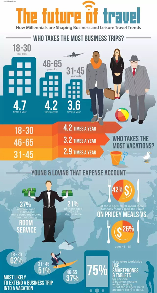 根據全球公司波士頓咨詢集團(BCG)的研究報告,到2020年,商務旅客里面將有一半以上都是千禧一代。雖然這代人可能會受可支配收入的限制,但是他們會比年長的旅客更多地把旅行看成一種追求娛樂體驗的手段。
