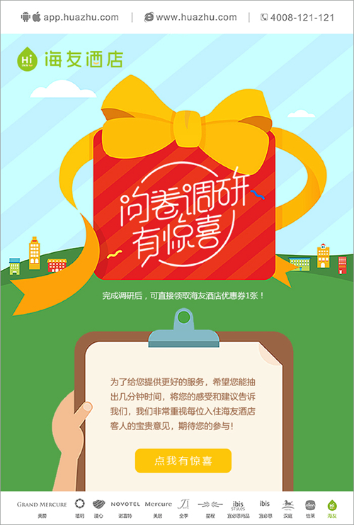本次調研自10月10日上線到11月9日截止,調研范圍涵蓋全國330余家門店,此外,該活動還在華住APP、華住官方微信、海友官方微信及微博、EDM等線上渠道全方位推廣。活動期間,所有到店消費的賓客均可參與調研,通過掃碼進入H5頁面完成問卷,提交有效問卷的賓客便可獲得海友酒店優惠券,獲獎概率達100%。
