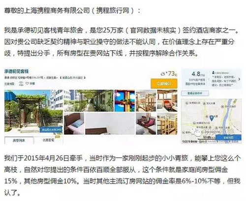 此前,一篇名為《致攜程的一封分手信》的網帖在朋友圈熱傳,便是直指攜程缺乏契約精神以及“亂漲”傭金費用,導致青年旅社提出與攜程“分手”。