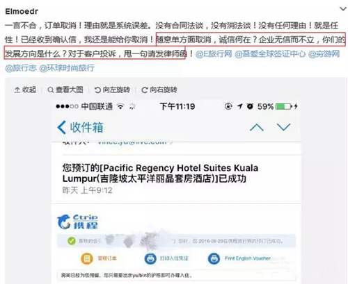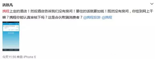 圖2:網友發微博在攜程購買假機票無座、訂房到店無房、單方面取消訂單等