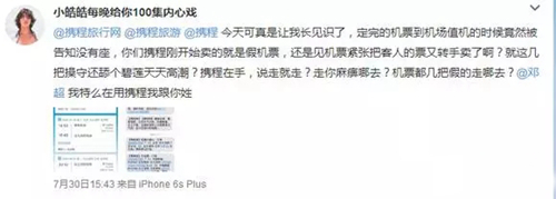 網友“小皓皓每晚給你100集內心戲”微博控訴攜程稱,其在7月27日在攜程網預定北京飛烏蘭浩特往返機票,在乘機當日在機場辦理值機時,竟然被告知無座。足以證明攜程售賣假機票,侵害了消費者權益。網友稱:“攜程這樣的操守怎么好意思說‘攜程在手,說走就走’,機票是假的還能走到哪去?”
