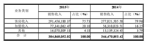 在報(bào)告期間,布丁股份2015年度、2014年度的主營(yíng)業(yè)務(wù)分別為3.85億元、3.46億元,其中客房銷售收入占比最大,分別為2.91億元、2.77億元,而加盟銷售收入分別為0.77億元、0.56億元。