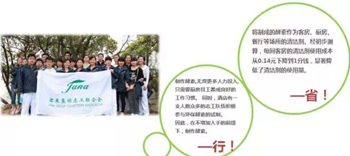 該飯店總經理曹蘭蘭說:“原來我們用清潔劑清潔客房,平均下來每一間房間花費0.14元,現在用了酵素后下降到了0.01元。”原來,酵素是一種酶,具有凈化和抗菌的功能。無錫君來湖濱飯店以每天用剩的大量的果皮和蔬菜為原料,加上黑糖或者紅糖制作成酵素清潔劑,應用在客房、公共區域衛生間、廚房、地面、墻磚的清潔上,既衛生又環保。“這種變廢為寶,不僅減少了垃圾的排放,還為飯店節省了大量清潔費用,這一飯店環保節支的新嘗試值得我們學習。”多位與會嘉賓表示。