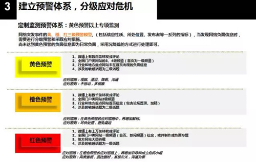 劉蕾認為,酒店要從根本上提升風險防控能力,把危機隱患扼殺在萌芽狀態,而不是后續應對。可將輿情風險評估納入日常風險評估中;實行輿情風險通知單制度;全面總結酒店業輿情風險類型;重要決策、項目、活動前開展風險評估等。“酒店業的很多重大投訴都發生在夜晚、凌晨時分,酒店平時就要培訓、訓練員工監測應對輿情,建立黃色、橙色、紅色預警分級管理體系,科學分析研判,分級應對,把輿情管理工作常態化。