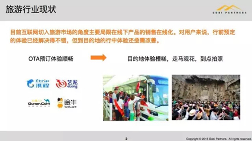 這是我們認(rèn)為現(xiàn)在整個(gè)旅游行業(yè)的現(xiàn)狀,攜程可能有快15年了,整個(gè)和互聯(lián)網(wǎng)相關(guān)的旅游行業(yè),大家主要在做的都是把線下品牌的銷(xiāo)售在線化,從消費(fèi)者的體驗(yàn)來(lái)看,其實(shí)你預(yù)定的流程體驗(yàn)已經(jīng)解決得不錯(cuò)了。不管你現(xiàn)在去攜程下面的哪個(gè)品牌OTA,或者像途牛、同程之類(lèi)的,其實(shí)我覺(jué)得都解決得不錯(cuò),但是到目的地的體驗(yàn)我們覺(jué)得還是有待改善的,這是整體對(duì)旅游行業(yè)大的看法,所以也會(huì)導(dǎo)致我們投資策略的一些變化。