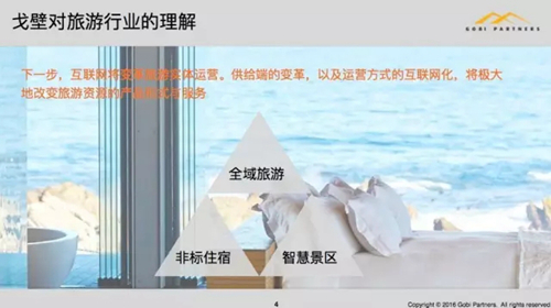 首先感謝主辦方給我這么一個(gè)機(jī)會(huì)跟大家交流一下,作為一個(gè)早期創(chuàng)投我們是怎么看非標(biāo)的美宿品牌。先簡(jiǎn)單介紹一下戈壁,其實(shí)我們是比較標(biāo)準(zhǔn)的互聯(lián)網(wǎng)創(chuàng)投,主要是做早期A輪的項(xiàng)目,之前也是互聯(lián)網(wǎng)相關(guān)的項(xiàng)目做得比較多。我們也和旅游有一些淵源,我本人很偶然加入了VC行業(yè),之前是負(fù)責(zé)藝龍網(wǎng)站的。第一個(gè)公司投的是途牛,所以和旅游有比較大的淵源,我們對(duì)旅游行業(yè)也是做了一些分析,也是今天和大家共享一下我們的觀點(diǎn)和看法。