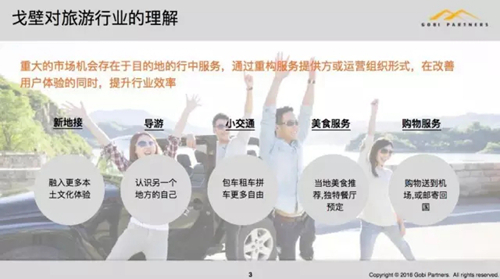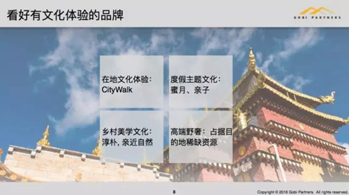 到現(xiàn)在這個(gè)階段,我們覺(jué)得可能平臺(tái)的機(jī)會(huì)更難一點(diǎn),我們會(huì)更關(guān)注品牌類(lèi)的機(jī)會(huì),我們認(rèn)為重大的市場(chǎng)機(jī)會(huì)會(huì)在目的地的行中服務(wù)上,可以通過(guò)重構(gòu)服務(wù)提供方或者是運(yùn)營(yíng)組織的形式。那我們認(rèn)為有挺重要的兩點(diǎn),第一點(diǎn),消費(fèi)者的整個(gè)體驗(yàn)要得到改善或者是不同;第二,還是希望能夠提升行業(yè)效率。下面是一些例子,比如說(shuō)新的地接怎么樣融入更多本土的文化,車(chē)導(dǎo)服務(wù)其實(shí)我們也投了不少這方面的標(biāo)的,像美食的服務(wù),不管是國(guó)內(nèi)的還是國(guó)外的,其實(shí)很多民宿在當(dāng)?shù)氐耐撂禺a(chǎn)是做得非常好的。