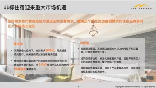 下面講一下非標(biāo)住宿,我們對(duì)非標(biāo)住宿一個(gè)大的需求理解,就是整個(gè)旅游的或者度假的需求,我們說(shuō)旅宿需求將取代商旅,其實(shí)商旅和度假還是有蠻多需求上的不一樣,所以會(huì)導(dǎo)致一撥新的機(jī)會(huì)。我們的理解是基本上度假和商旅是7:3的關(guān)系,08年的時(shí)候大概是3:7,現(xiàn)在我自己的感覺(jué)是5:5,所以我們整體投資雖然在旅游大概有十幾家公司的布局,都是和休閑旅游相關(guān)的,商旅我們看得比較少。