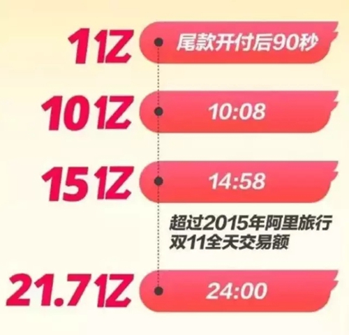 飛豬交易額度高達(dá)21.7億,尾款開付后90秒后即超過1億,并于下午14:58分超過去年阿里旅行雙十一全天紀(jì)錄。