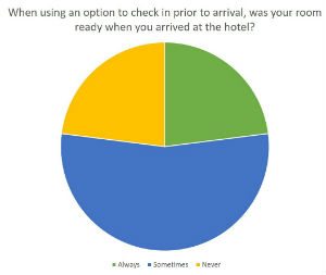 23%使用移動(dòng)端辦理入住的旅客表示,他們“從來沒有”發(fā)現(xiàn)到達(dá)后客房可立即入住。54%的客人表示客房“有時(shí)”是已經(jīng)準(zhǔn)備好可隨時(shí)入住的。
