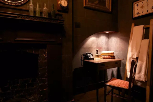 房間內部盡量還原了城堡的細節(jié),從石頭墻壁、拱形過道到屋內的箱子和厚重的窗簾,都體現了一種哥特式建筑的感覺。房間內的壁爐也是一個很有代表性的細節(jié),在《哈利波特與密室》中,哈利就是撒了飛路粉通過壁爐不小心竄到了翻倒巷,探索到了魔法世界的另一面。
