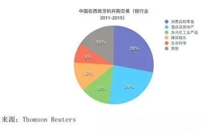 西班牙酒店旅游業(yè)在經(jīng)濟(jì)復(fù)蘇后展現(xiàn)出了強(qiáng)勁的發(fā)展勢(shì)頭,尤其注重海外市場(chǎng)的擴(kuò)張戰(zhàn)略。另外中國(guó)資本也一直密切關(guān)注著西班牙的酒店旅游市場(chǎng)。海航集團(tuán)再次收購(gòu)了西班牙酒店管理公司NH酒店集團(tuán)(NH Hotels)8.3%的股份,加上其在2013年4月收購(gòu)的20%的股份,海航集團(tuán)共計(jì)持有NH酒店集團(tuán)29.5%的股份 。2013年9月江蘇金浦集團(tuán)股份有限公司收購(gòu)西班牙格魯波特酒店及度假村Grupotel Valparaiso Palace,交易金額達(dá)到6893萬(wàn)美元 ,2015年4月重慶康德實(shí)業(yè)收購(gòu)西班牙Hotel Barcelo Santiago酒店集團(tuán),交易金額達(dá)到5000萬(wàn)歐元 。正如下圖所示,中國(guó)在西班牙已公開(kāi)的并購(gòu)交易中,酒店房地產(chǎn)業(yè)也位居中國(guó)投資西班牙總交易額的第二位。西班牙酒店業(yè)前景是不容小覷的。