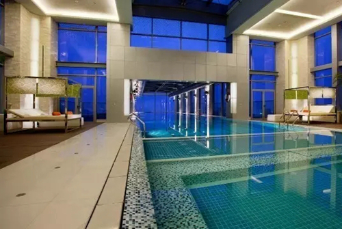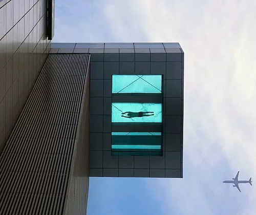 這么炫的設計,在國內也有哦!中國第一座天幕室內泳池,位于浦東綠地假日酒店24層。泳池總長30米,寬6米,深1.5米,由內部延伸出建筑外部,懸掛在高空之中。
