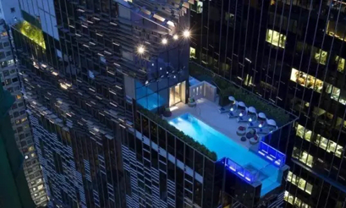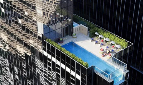 國際建筑事務所Aedas在香港設計了英迪格(Indigo)酒店,其特色是在酒店頂樓(29層)的邊緣上懸浮著一個游泳池。