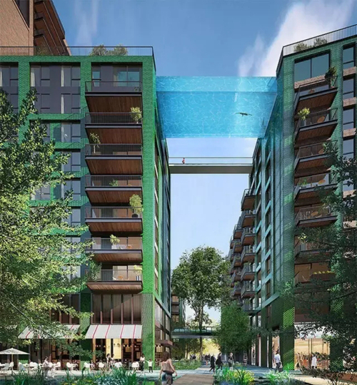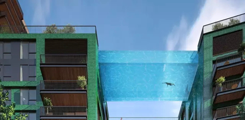 這個通體透明且無結構的泳池被稱為“SkyPool”,坐落在倫敦泰晤士河岸新區、巴特西發電廠旁邊,高懸在10層樓之上,長約27.4米,高約33.5米。