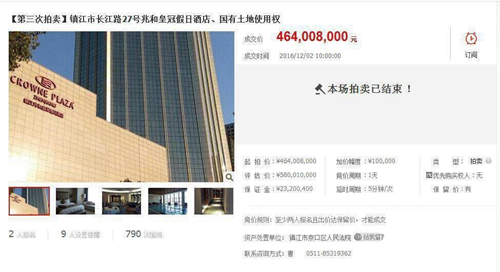 鎮江兆和皇冠假日酒店4.6億余元成功拍賣