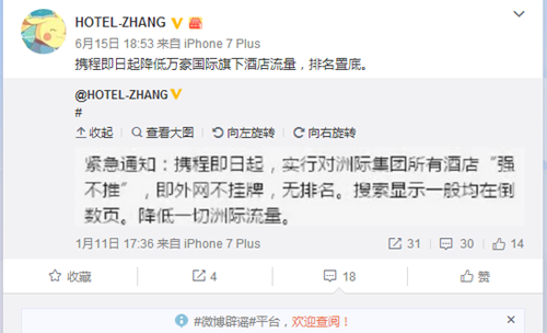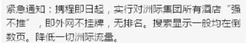 早在今年1月11日,“HOTEL-ZHANG”也發布微博曝光過攜程類似行為,“緊急通知:攜程即日起,實行對洲際集團所有酒店強不推,即外網不掛牌,無排名。搜索顯示一般均在倒數頁。降低一切洲際流量。”
