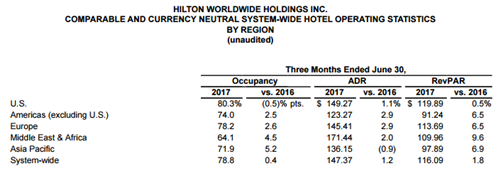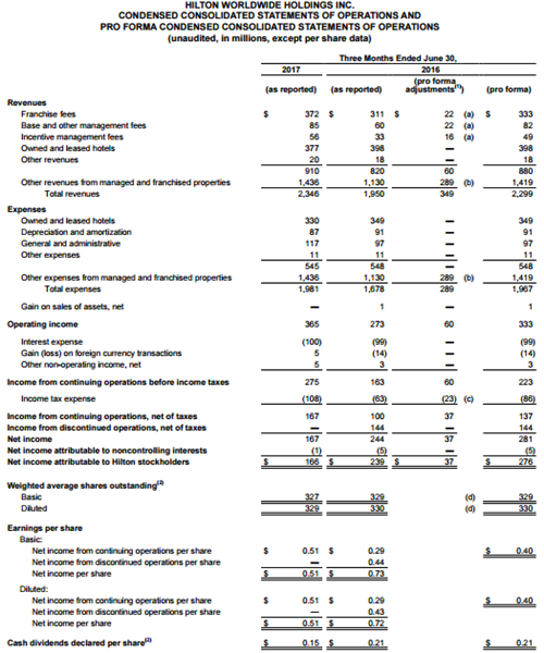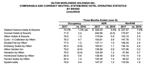 截至 2017年6月30日的第二季度,希爾頓的核心財務數據如下: