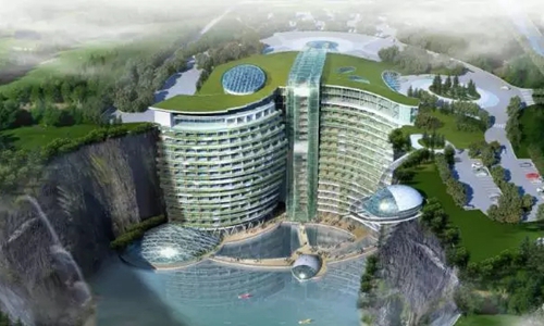 在上海佘山一個深約80米、超過3.6萬平方米的曠坑中,呈半圓形的世茂深坑酒店掛在深坑內的崖壁上,呈現出神秘的美感。這個明年即將試營業的浩大項目歷時十年,從廢棄礦坑到五星酒店,凝聚了世茂無數心血。
