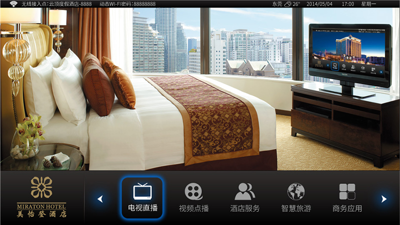 新聞來源:宏輝智通 發布日期:2015-11-29 瀏覽次數:11789深圳宏輝智通科技有限公司在2014年8月成功為美怡登酒店實施酒店IPTV方案,我們將繼續秉承客戶第一的理念為酒店打造一個穩定和具有時代象征的酒店IPTV系統,我們擁有多年的實施方案的經驗,并擁有強大的技術后盾和UI設計團隊。讓每一個成為我們實施的合作伙伴都感受到專業和精致!