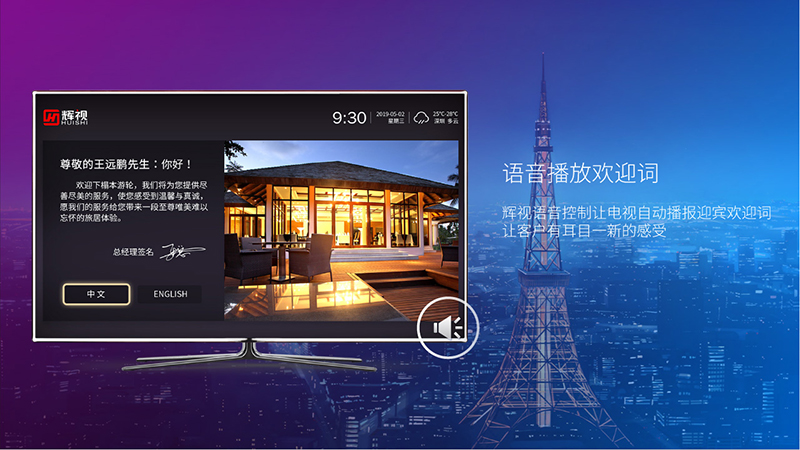 打開電視機,歡迎詞不在是單純的顯示在電視界面上,輝視語音控制讓電視自動播報迎賓歡迎詞,讓客戶有耳目一新的感受。
