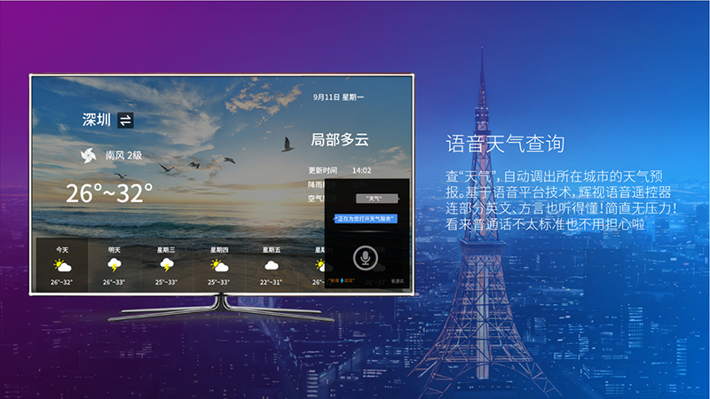 查“天氣”,自動調出所在城市的天氣預報。基于語音平臺技術,輝視語音遙控器連部分英文、方言也聽得懂!簡直無壓力!看來普通話不太標準也不用擔心啦