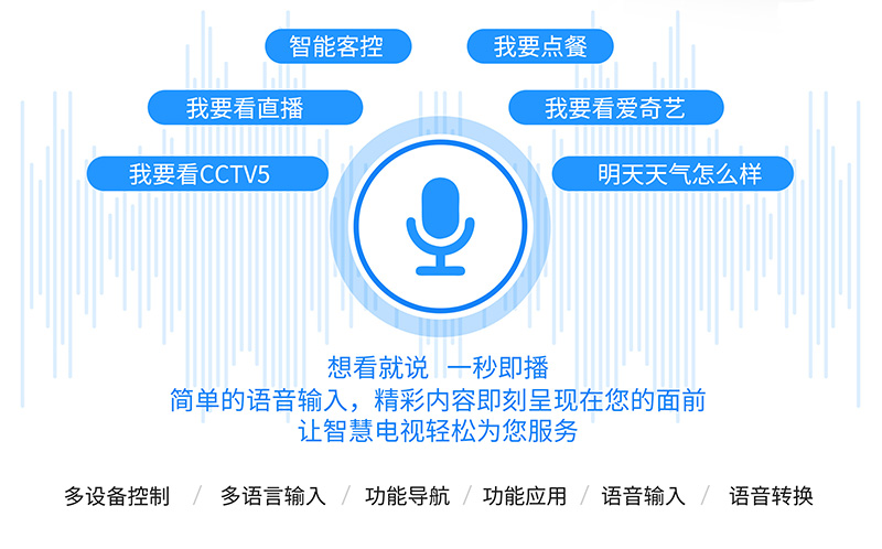 語音控制是電視智能化的標志之一,它具有語音控制換臺、關機、語音搜索影視、音樂資源等功能。不用遙控器、不用換電池,你說它聽,你說它做。區別于傳統遙控器的按鍵操作、拼音搜索,用戶只需語音對話,即可方便快捷地實現直播切換、點播搜索、應用調取及百科查詢等功能,極大提升了iTV用戶操作中的靈活性與便捷性。不會說普通話?不用擔心 ,輝視語音遙控在語音識別引擎上,做了多語種識別。方言那又怎么樣?智能語音遙控器照樣說到做到。